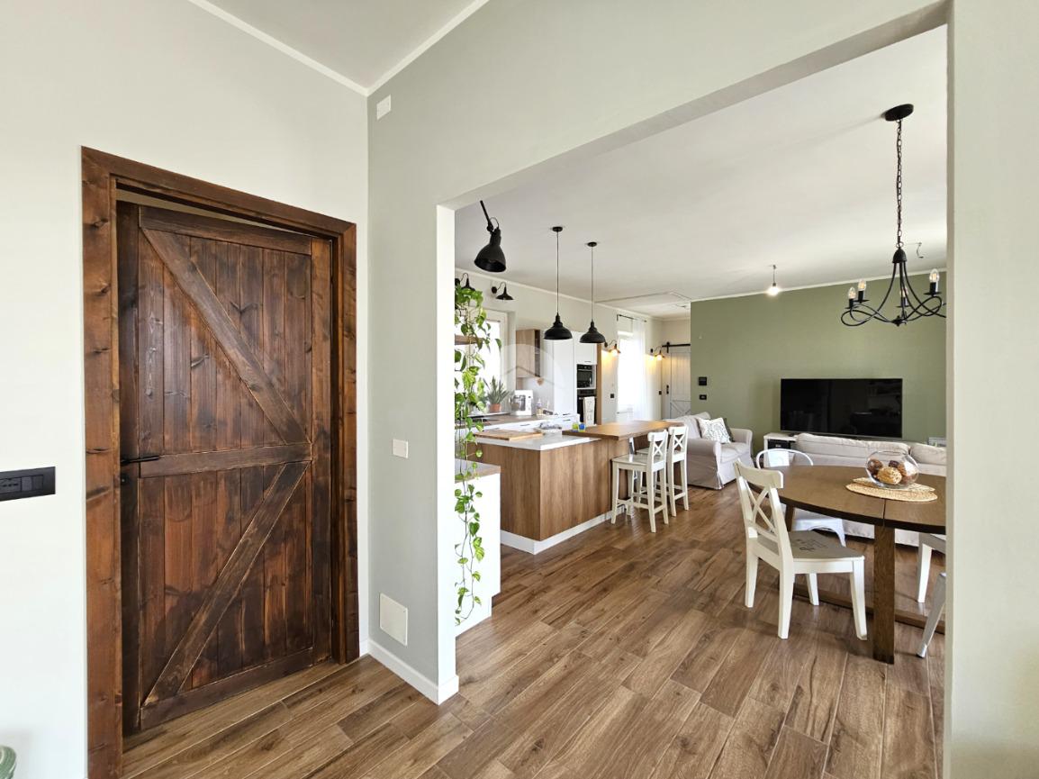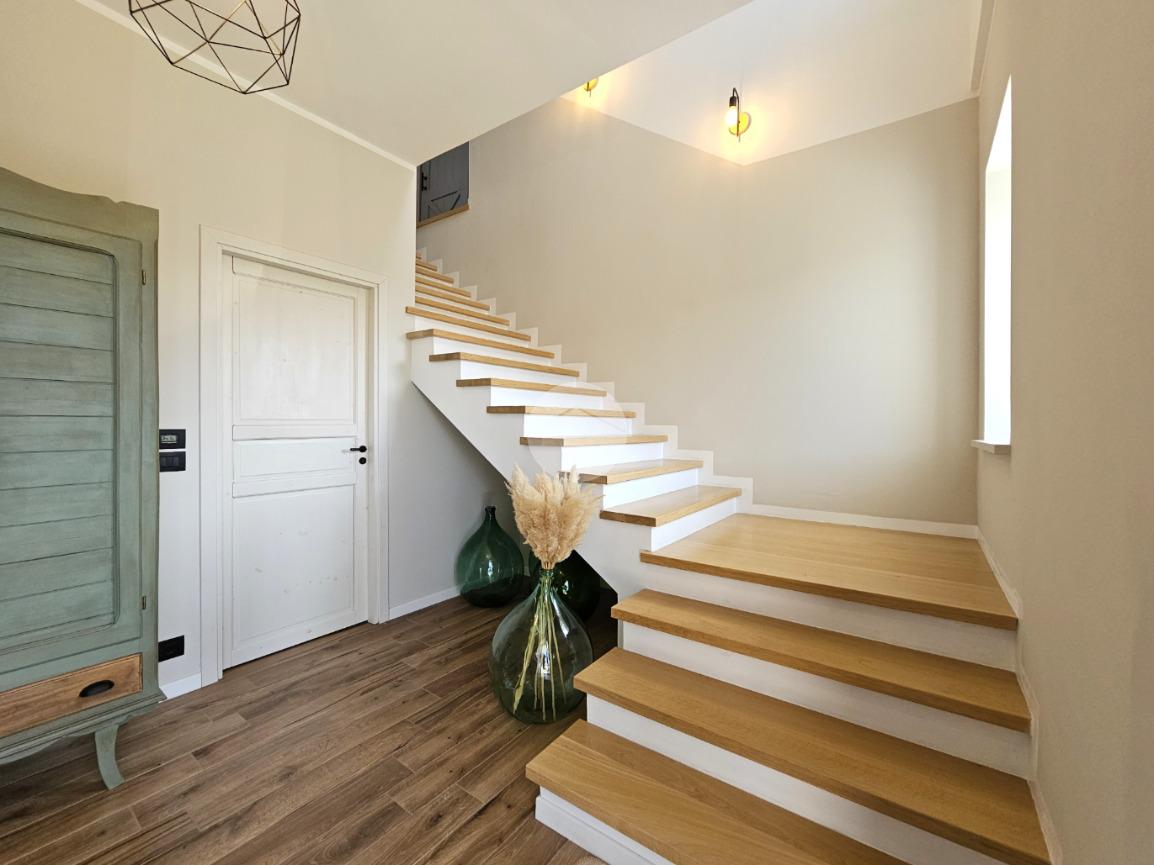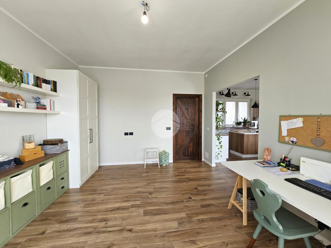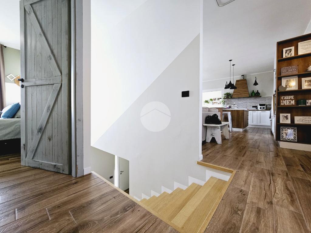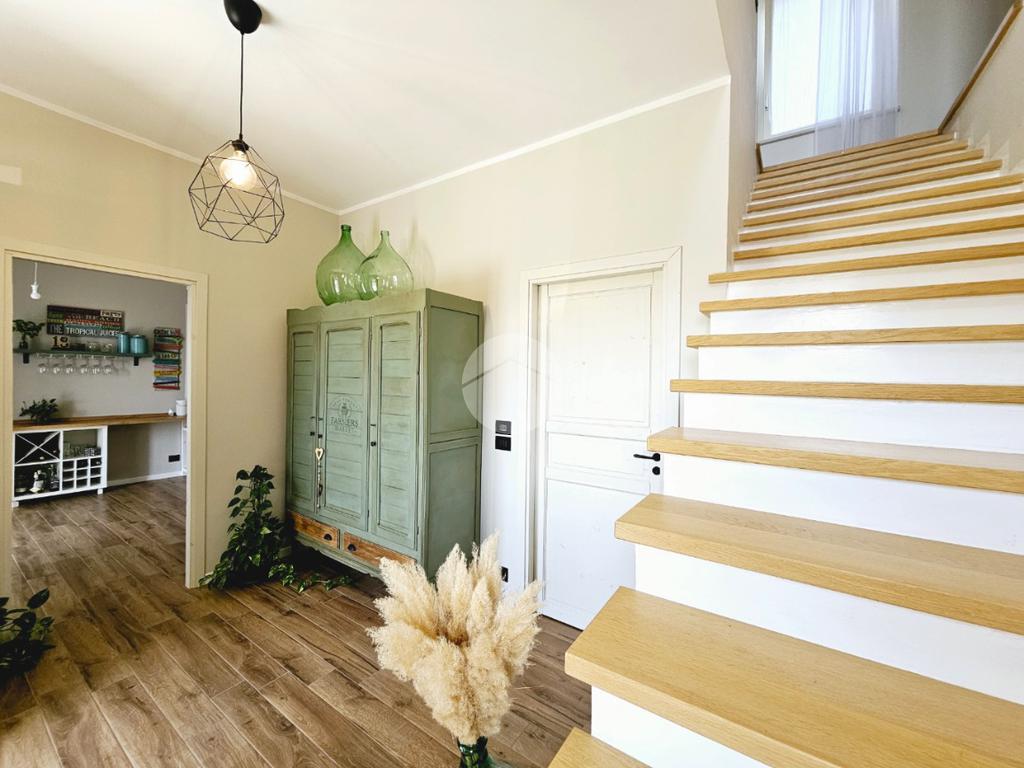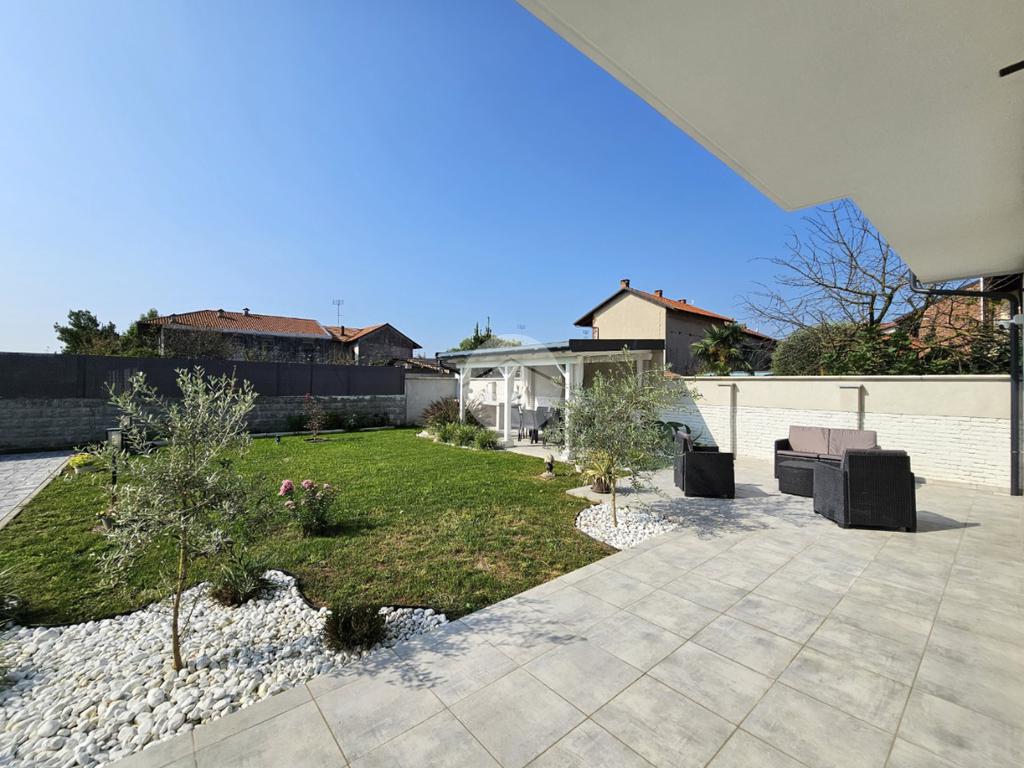 MAZZE' - Frazione Tonengo: Casa indipendente completamente ristrutturata con giardino privato. L'abitazione si sviluppa su due livelli collegati tramite scala interna per un totale di 165 mq. calpestabili. Al piano terra: ingresso mediante portoncino blindato e accesso al disimpegno spazioso dal quale si accede a due stanze ad uso soggiorno, studio e zona relax. Sullo stesso livello sono presenti un bagno di servizio, dotato di doccia con attacco per la lavatrice e il vano tecnico nel quale sono state installate la caldaia e la pompa di calore per l'acqua calda sanitaria. Il piano superiore è costituito da una zona giorno di 45 mq. con cucina a vista, due camere da letto e due bagni spaziosi dotati di vasca e doccia. Tutte le stanze hanno lo sfogo esterno sul balcone. Gli infissi della casa sono in pvc, effetto legno con doppi vetri e zanzariere. Il riscaldamento è a pavimento su entrambi i livelli, alimentato a metano e ogni stanza dispone di termostato autonomo. Inoltre la casa dispone di climatizzatori caldo/freddo, predisposizione dell'antifurto, videocitofono con controllo da remoto, canna fumaria in acciaio e predisposizione per pannelli fotovoltaici. La proprietà è stata recentemente oggetto di completa e totale ristrutturazione, con stato di fatto attuale pari al nuovo. All'interno delle opere eseguite è stato realizzato anche l'insufflaggio nelle pareti per l'isolamento termico. L'unità immobiliare viene completata da una tettoia esterna di 12 mq. e da un box auto doppio di 30 mq. dotato di portone sezionale. La buona distribuzione degli ambienti interni consente ulteriori personalizzazioni ai fini di sfruttare al meglio tutti gli spazi presenti.